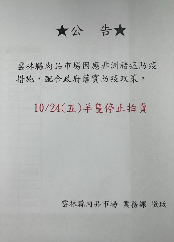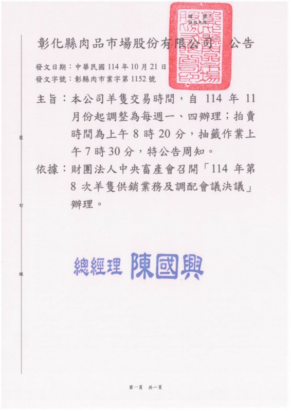 彰化縣肉品市場羊隻交易拍賣時間自11月份起調整為每周一及周四辦理,拍賣時間為上午8:20,抽籤時間為上午7:30,請進出肉品市場載運車輛加強消毒,落實防疫工作。...